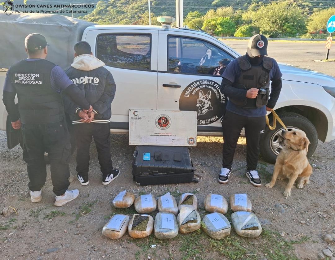 En la madrugada de hoy, mientras efectivos de la División Canes Antinarcóticos, dependientes de la Dirección Drogas Peligrosas de la Policía de la Provincia, realizaban un operativo de control vehicular e identificación de personas en la Ruta Nacional N° 38, a la altura del empalme con la Ruta Provincial N° 2, Dpto. Valle Viejo, procedieron a controlar un colectivo perteneciente a una empresa de turismo, proveniente de la provincia de Jujuy con destino a Mendoza.