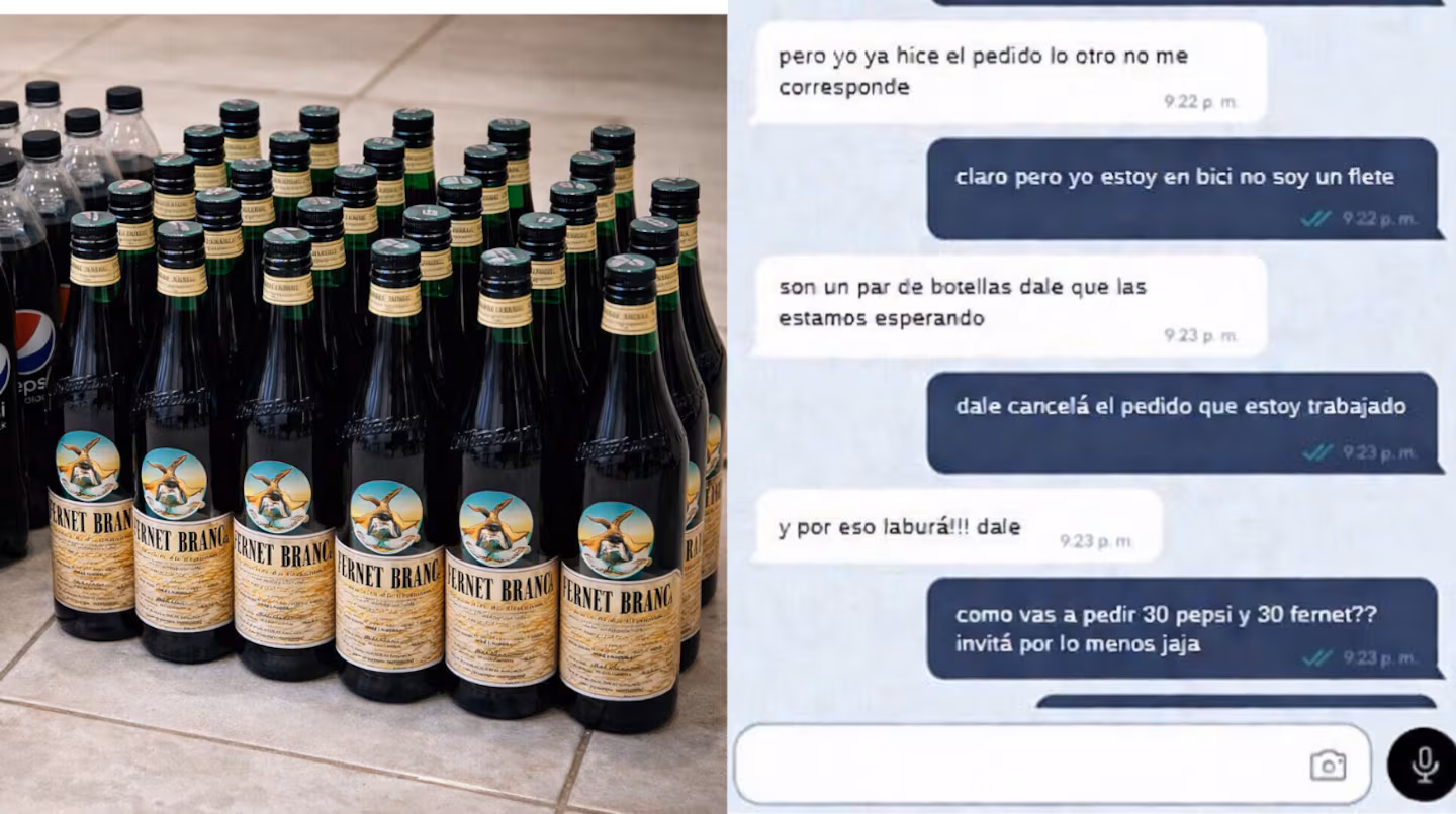 El ida y vuelta comenzó cuando el delivery le pidió al usuario que cancelara un encargo de 30 gaseosas y 30 fernets, ya que le resultaba imposible trasladarlo. “No te puedo alcanzar el pedido, es muy grande y estoy en bici”, le explicó.
