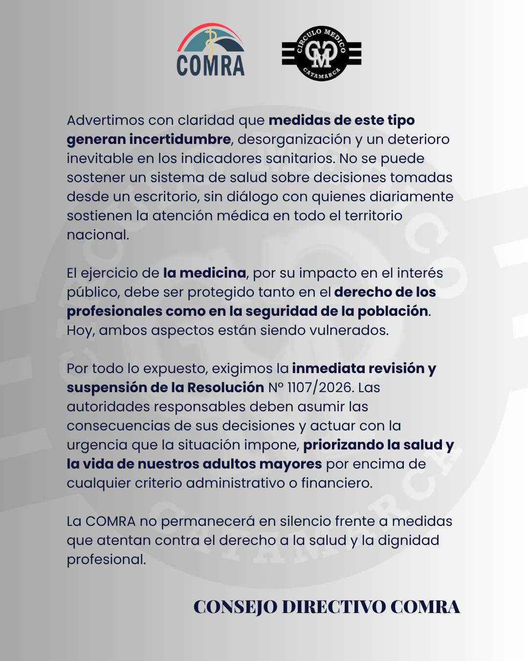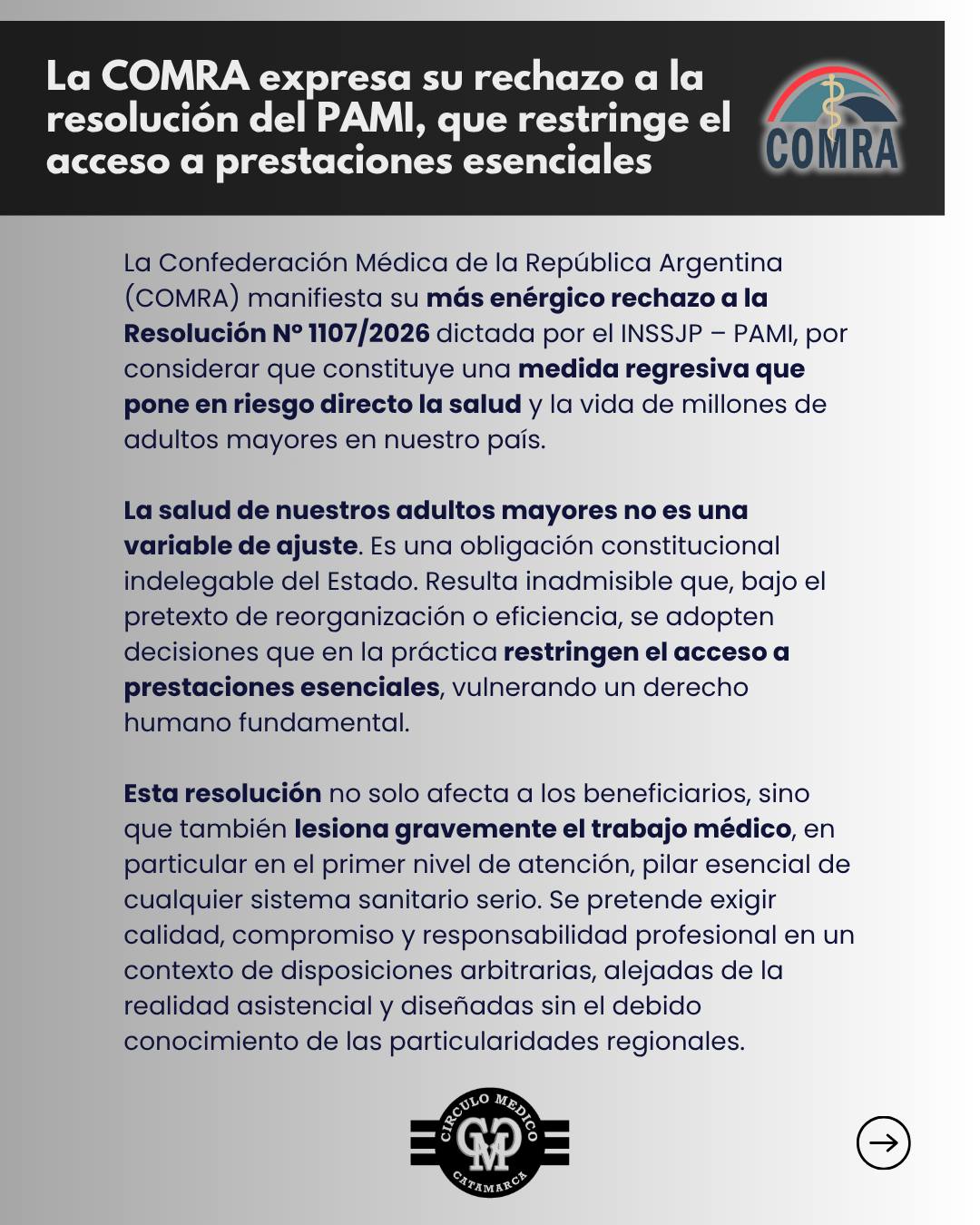 El Círculo Médico de Catamarca acompaña y difunde el comunicado de la Confederación Médica de la República Argentina (COMRA), expresando su profunda preocupación y rechazo ante las medidas adoptadas en el ámbito de PAMI, que ponen en riesgo la atención de nuestros adultos mayores y las condiciones del ejercicio profesional.