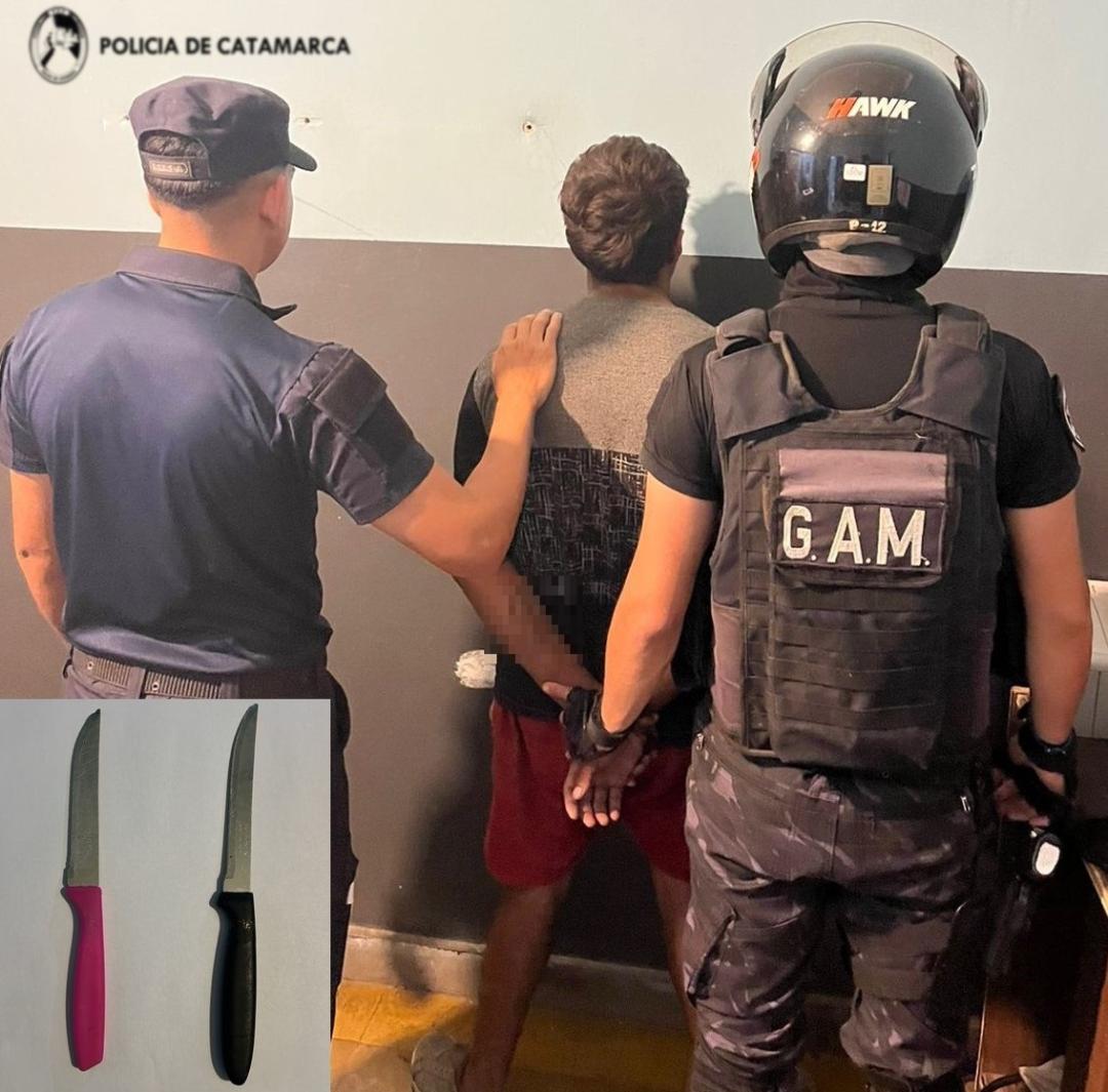 En el lugar, los policías se entrevistaron con una joven mujer de 28 años, quien manifestó que una persona del sexo masculino la habría amenazado con dos cuchillos tipo tramontina tanto a ella como a los vecinos, para luego darse a la fuga, por lo que de inmediato realizaron recorridos y en las inmediaciones, con colaboración de sus pares del GAM-Pampa, lograron aprehender al presunto autor del hecho de apellido Bazán (19), quien tenía en su poder las armas blancas que quedaron en calidad de secuestro.