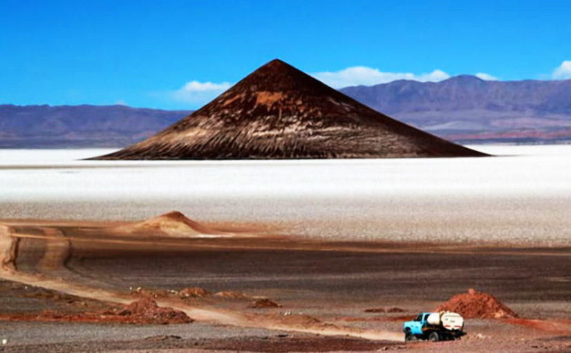 Ubicado en el corazón del Salar de Arizaro, este cono alcanza aproximadamente 200 metros de altura y se eleva en soledad sobre una inmensa superficie blanca, creando una postal casi irreal. Su simetría es tan precisa que durante años se creyó que podía tratarse de una construcción humana, aunque los estudios geológicos confirmaron su origen natural: un cono volcánico que nunca llegó a erupcionar.