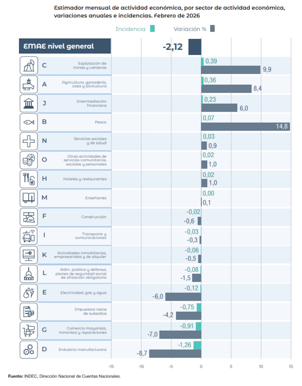 “Con relación a igual mes de 2025, ocho de los sectores de actividad que conforman el EMAE registraron subas en febrero. Se destacaron Pesca (14,8% i.a.) y Explotación de minas y canteras (9,9% i.a.)”, señaló el Indec.