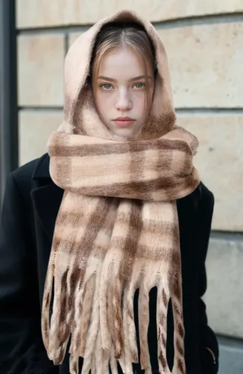 Sobre los hombros (tipo capa): extendé la bufanda sobre la espalda y los hombros sin ajustarla al cuello. Podés dejarla suelta o sujetarla con un cinturón en la cintura. Es ideal para sumar volumen y lograr un look elegante sin esfuerzo.