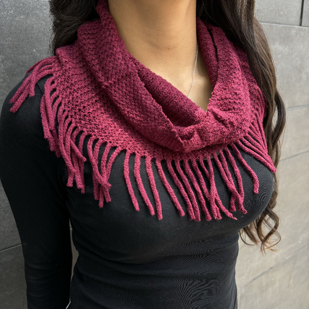 Tipo chal (elegante y versátil): abrí completamente la bufanda y colócala sobre los hombros cubriendo parte de los brazos. Podés llevarla suelta o cruzarla al frente. Es ideal para ocasiones más formales o para looks en capas.