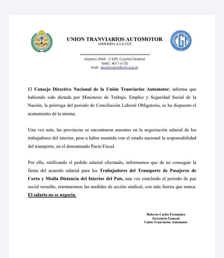 Tras la reunión mantenida, el gremio UTA manifestó que habrá colectivos de corta y media distancia mientras dure la conciliación obligatoria. Pero aclararon que de no llegar a un acuerdo en ese periodo, retomarán las medidas de fuerza.