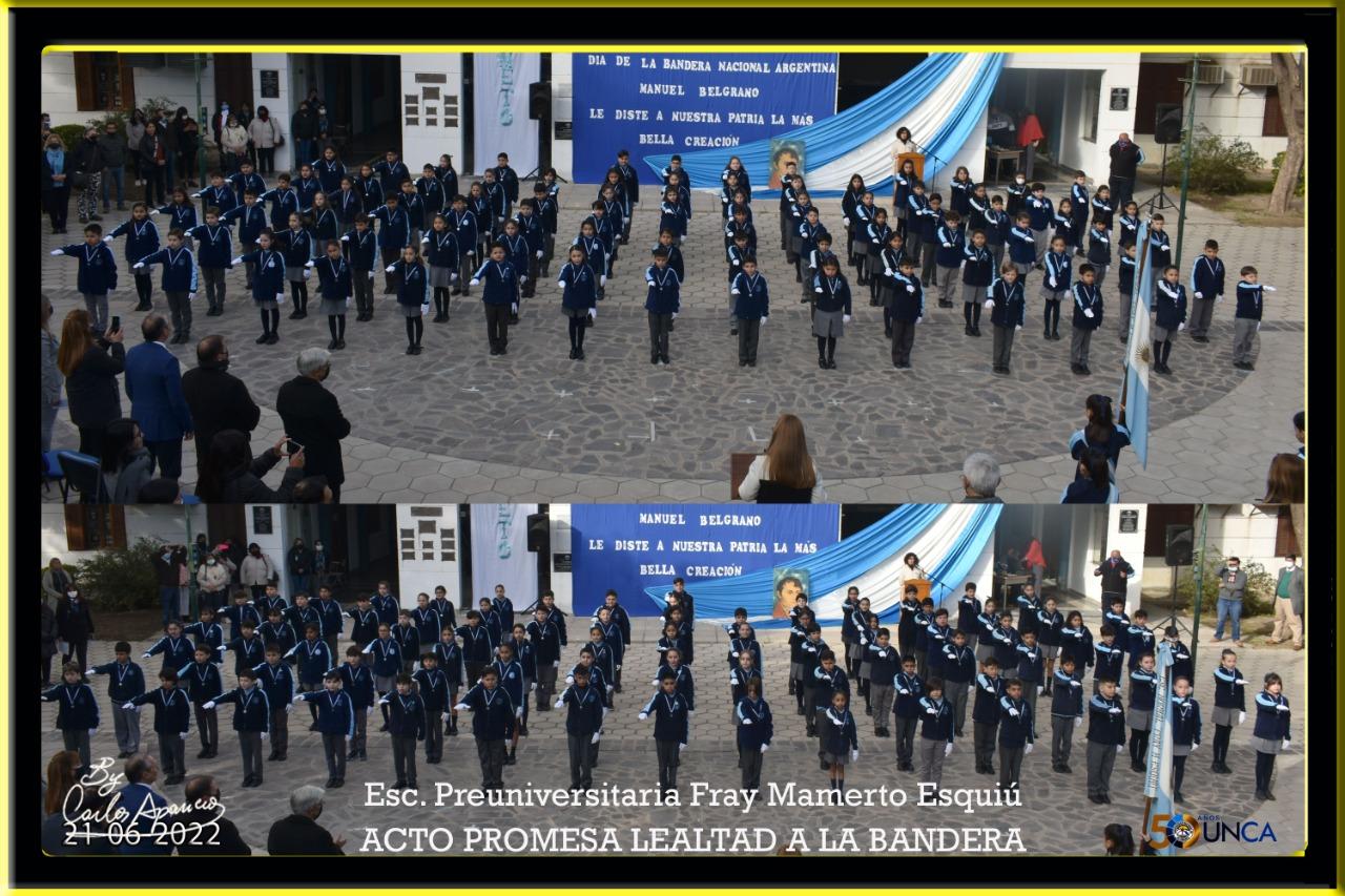 Los alumnos de cuarto y sexto grado de la Escuela PreUniversitaria Fray Mamerto Esquiú en un emotivo y cálido acto realizaron su Promesa de Lealtad a la Bandera, en conmemoración al 202° Aniversario del fallecimiento de su creador Manuel Belgrano.