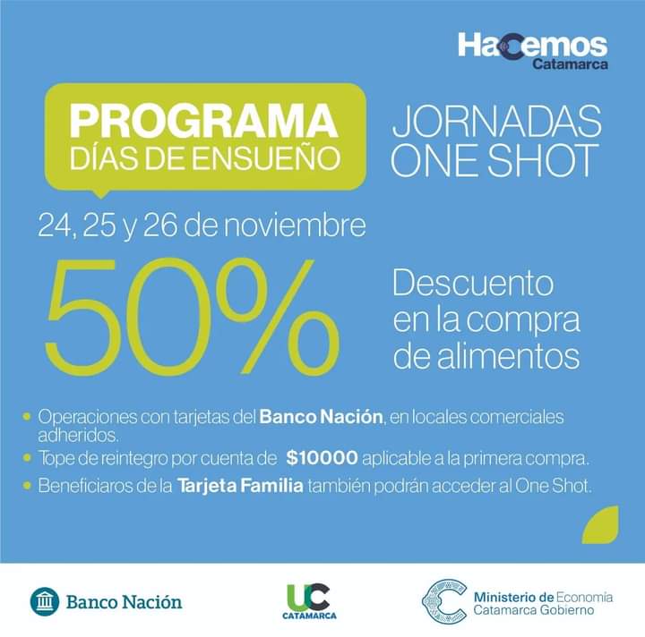 El beneficio del Programa que prevé un tope de reintegro de $10.000 por cuenta, que regirá desde el jueves 24 hasta el sábado 26 de octubre, sólo en la compra de alimentos en comercios de capitales catamarqueños. Las operaciones deben realizarse únicamente con tarjetas de crédito del Banco de la Nación Argentina y beneficiarios de la Tarjeta Familia.