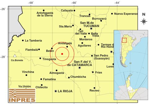 Epicentro: 101 km al NO de San F. Del Valle De Catamarca; 172 km al N de La Rioja; 41 km al SO de Andalgalá -27.881 (lat) -66.549 (long)