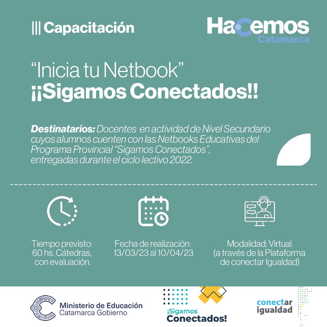 El Ministerio de Educación y la Dirección Provincial de Educación a Distancia, informa que se encuentra abierta la inscripción para la capacitación “Inicia tu Netbook” destinado a docentes en actividad de nivel secundario cuyos alumnos cuenten con las netbooks educativas del programa provincial “Sigamos Conectados”, entregadas durante el Ciclo Lectivo 2022.