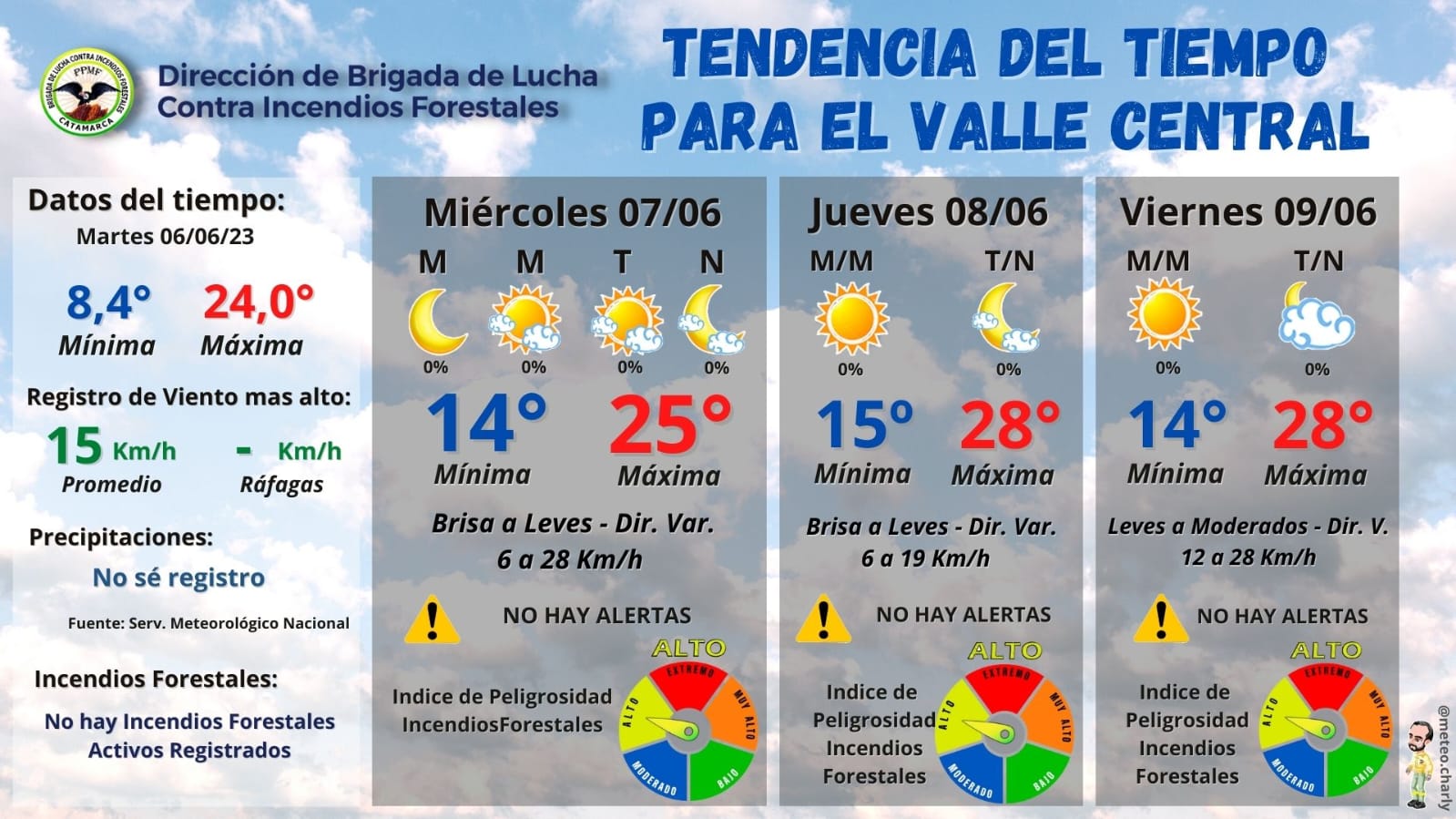 HOY: El día de hoy tendremos en cielo PARCIALMENTE NUBLADO A ALGO NUBLADO, con vientos entre BRISAS A LEVES en Direcciones Variables, la temperatura máxima será de 26°C y 12°C de Mínima. No hay probabilidad de precipitaciones.