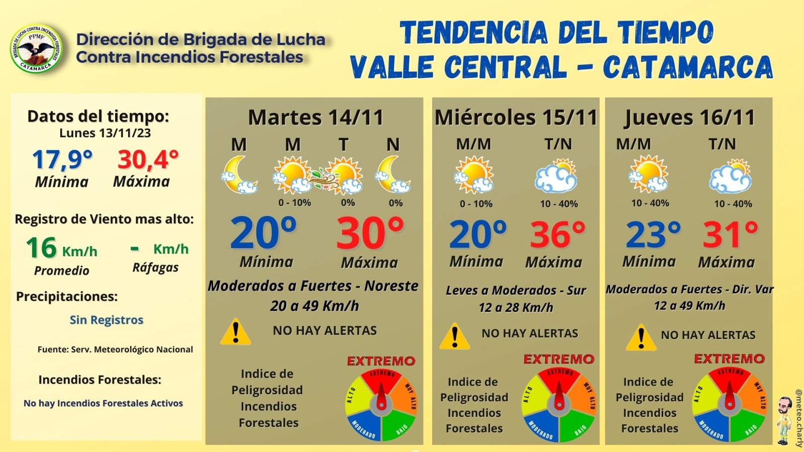 PARA LOS PRÓXIMOS DÍAS: Mañana Miercoles la temperatura máxima aumentara y llegara a los 36°C, con vientos LEVES A MODERADOS en Direcciones Variables y con Cielo ALGO NUBLADO A PARCIALMENTE NUBLADO. El SMN anuncia una probabilidad entre 10 a 40% de precipitaciones por la tarde.