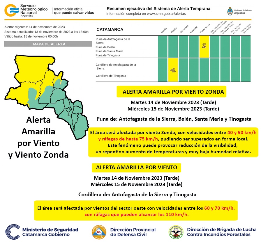 El área será afectada por viento Zonda, con velocidades entre 40 y 50 km/h, y ráfagas de hasta 75 km/h, pudiendo ser superados en forma local. Este fenómeno puede provocar reducción de la visibilidad, un repentino aumento de temperaturas y condiciones de muy baja humedad relativa.