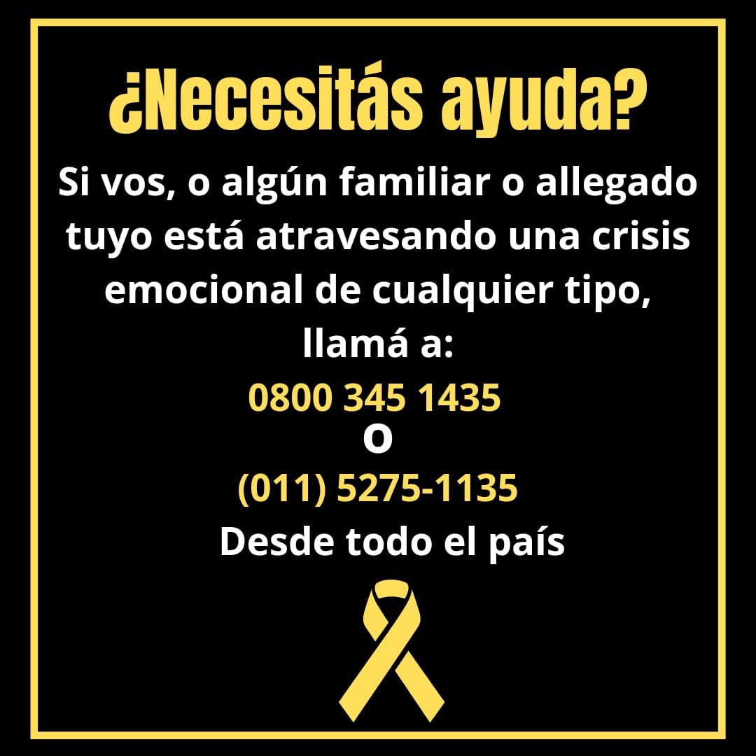 Si vos, o algún familiar o allegado tuyo está atravesando una crisis emocional de cualquier tipo, llamá al 135 (línea gratuita desde Capital y Gran Buenos Aires) al (011) 5275-1135 o 0800 345 1435 (desde todo el país). El llamado es personal, confidencial y anónimo.