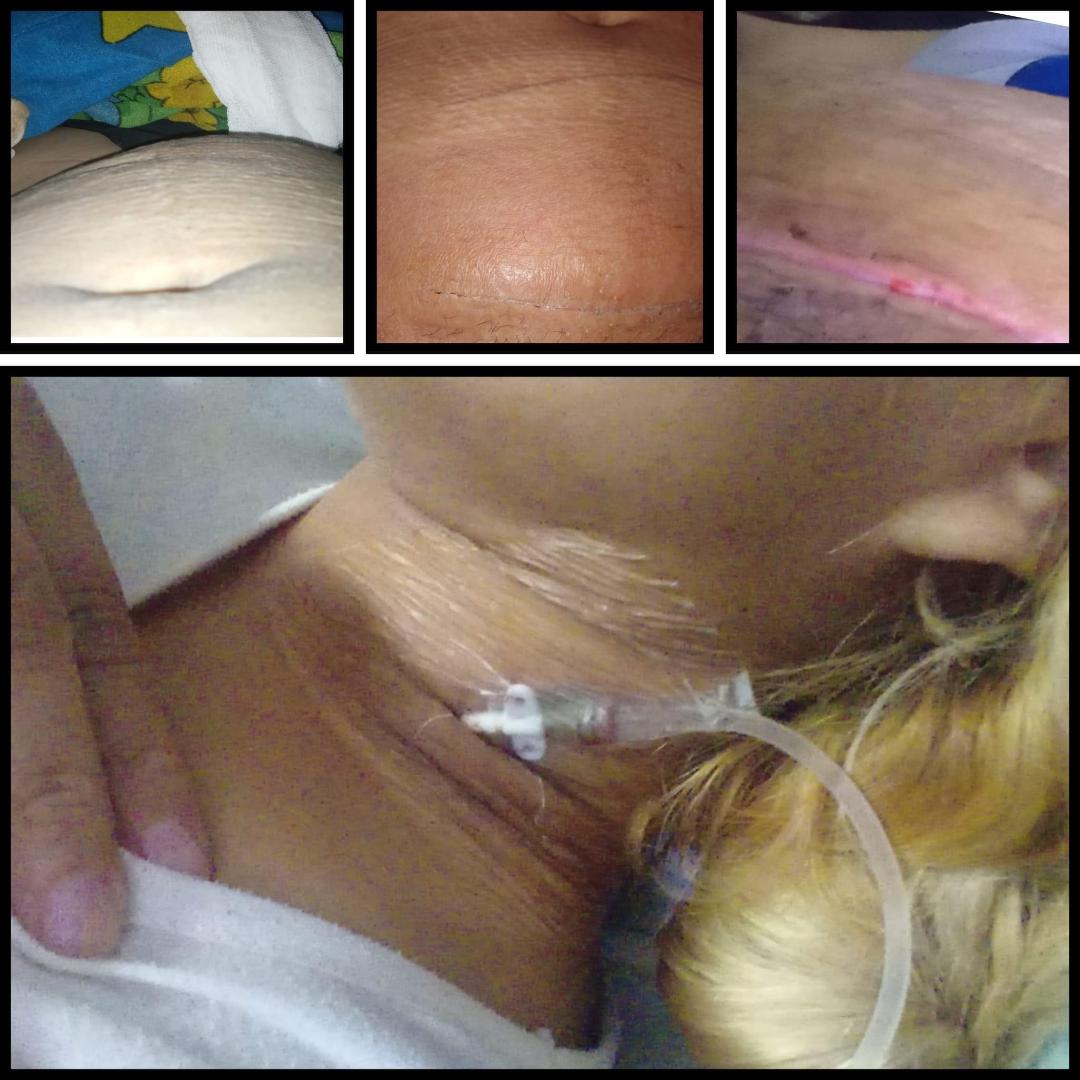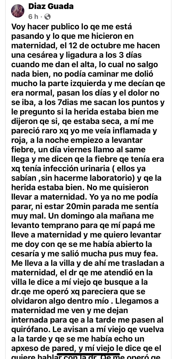 Voy hacer publico lo qe me está pasando y lo que me hicieron en maternidad, el 12 de octubre me hacen una cesárea y ligadura a los 3 días cuando me dan el alta, lo cual no salgo nada bien, no podía caminar me dolió mucho la parte izquierda y me decían qe era normal, pasan los días y el dolor no se iba, a los 7dias me sacan los puntos y le pregunto si la herida estaba bien me dijeron qe si, qe estaba seca, a mí me pareció raro xq yo me veía inflamada y roja, a la noche empiezo a levantar fiebre, un día viernes llamo al same llega y me dicen qe la fiebre qe tenía era xq tenía infección urinaria ( ellos ya sabían ,sin hacerme laboratorio) y qe la herida estaba bien. No me quisieron llevar a maternidad. Yo ya no me podía parar, ni estar 20min parada me sentía muy mal. Un domingo ala mañana me levanto temprano para qe mí papá me lleve a maternidad y me quiero levantar me doy con qe se me había abierto la cesaría y me salió mucha pus muy fea. Me lleva a la villa y de ahí me trasladan a maternidad, el dr qe me atendió en la villa le dice a mí viejo qe busque a la dr.qe me operó xq pareciera que se olvidaron algo dentro mío . Llegamos a maternidad me ven y me dejan internada para qe a la tarde me pasen al quirófano. Le avisan a mí viejo qe vuelva a la tarde y qe se me había echo un apxeso de pared, y mí viejo le dice qe el quiere hablar con la dr. Qe me operó qe es MARIA EUGENIA MONTIVERO, MATRÍCULA 2250 y le dijeron qe para eso tiene qe hacerle una nota al director de maternidad para que él le permita hablar. Se va mí viejo y ahí nomás me pasan a terapia, yo asustada no sabía qe pasaba xq corrían, se cansaron de pincharmé los brazos xq no me encontraban las venas, después me hacen una vía central y me hicieron una transfusión de sangre todo esto lo hicieron callado a mí no me decían nada. Me pusieron antibióticos a lo loco, les dije qe le avisaran a mí papá o a mí pareja qe yo estaba en terapia, me contestaban qe ya iba a venir la asistente social qe ella le iba avisar a mí familia, cosa qe nunca lo llamaron cuando mí papá está x llegar me bajan a sala común, mí viejo me ve y estaba muy mal. Los brazos vendado xq tenía inchados de tanto qe me pincharon, yo estaba muy anemica, desidratada, muy mal. A las 18:30 me pasan al quirófano, todo bien salgo muy bien. Me ponen mucho antibiótico a la semana me dan el alta salgo con la herida abierta xq no se coce 2veces qe eso se me iba a cerrar sola, iba. Acontrol x la cirugía y venía muy bien, a los días vuelvo con ese dolor en la parte izquierda y fiebre, vuelvo de nuevo x la guardia y me ponen un calmante y me mandan hacerme una ecografía, me decían qe podía ser qe un intestino se me había pegado o se me estaba haciendo de nuevo un apxeso de pared.