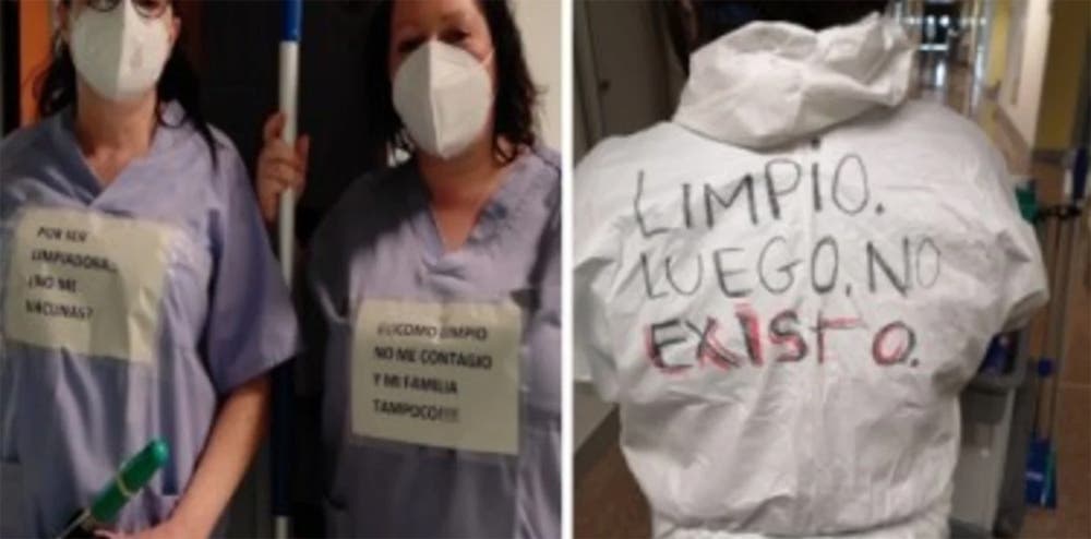 En este contexto, el personal de limpieza decidió presentarse a su trabajo con con carteles donde se leen mensajes como: "Limpio, luego no existo", "Por ser limpiadora… ¿no me vacunas?", "Como limpio, no me contagio y mi familia tampoco" o "Somos invisibles, pero no imprescindibles".