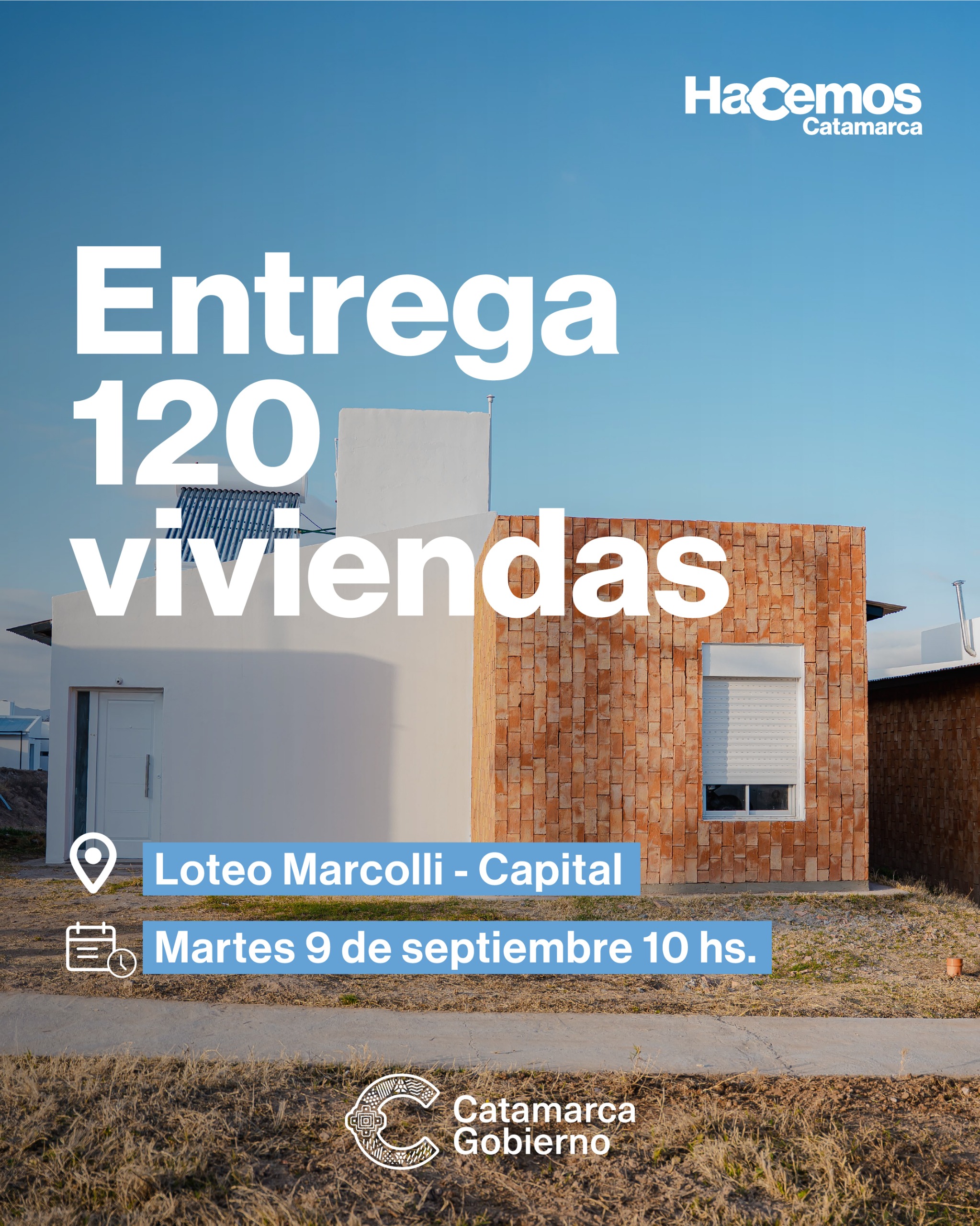 El Gobierno de Catamarca realizará este martes 9 de septiembre, a las 10:00, la entrega de 120 nuevas viviendas en el Loteo Marcolli, ubicado en las inmediaciones de Avenida Bicentenario.