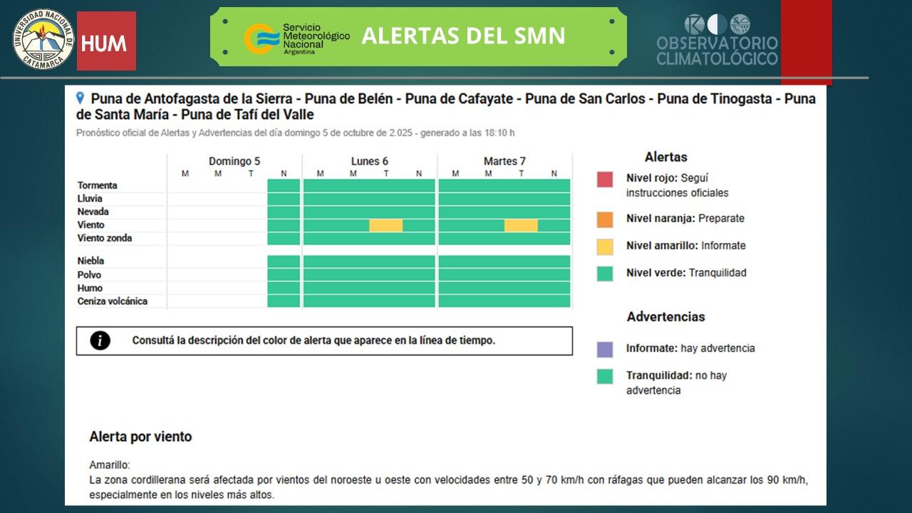Lunes 06/10: vientos del sector sur, ambiente templado y baja probabilidad de lloviznas (en serranías la chance sube durante el día). Desde martes se espera aumento notable de la velocidad del viento (regular a fuerte en varios sectores) y alertas en departamentos de altura/cordillera; jueves aparece como el día con menos riesgo de alerta aunque las temperaturas seguirán subiendo, y jueves–viernes se esperan las máximas más altas de la semana. En suma: tres días con vientos fuertes y final de semana caluroso.