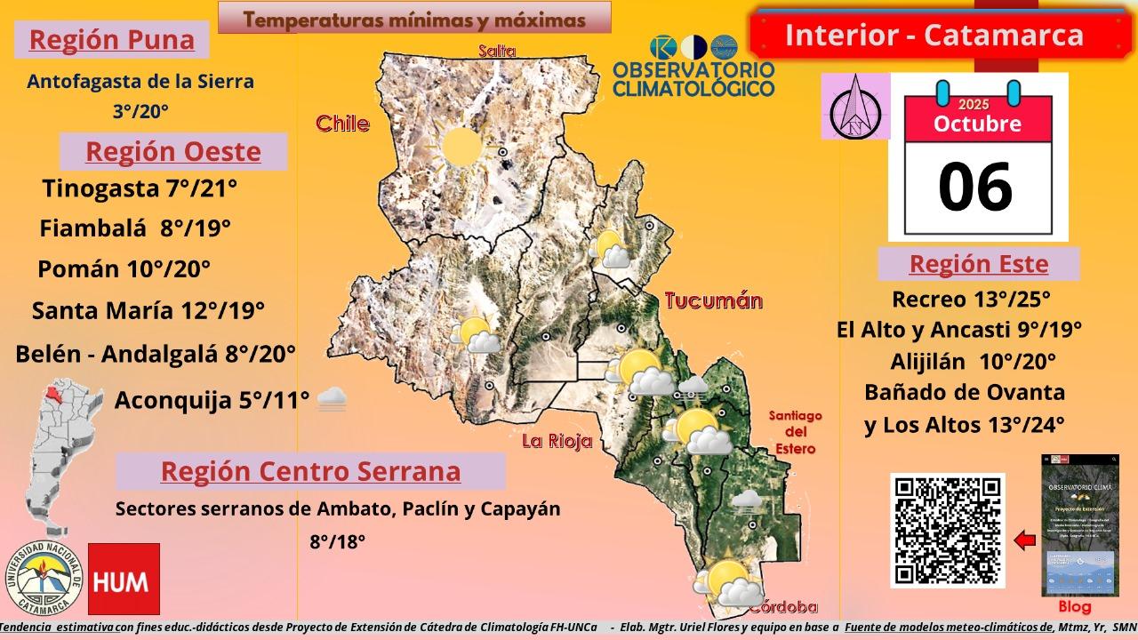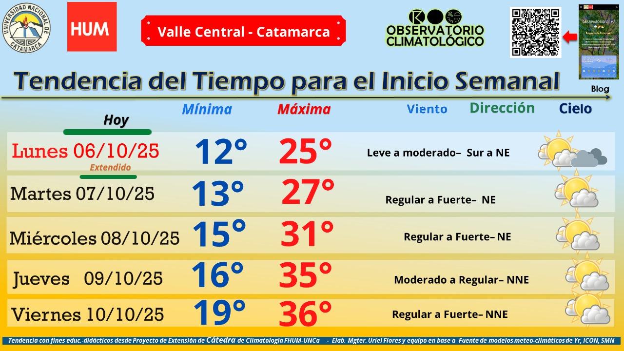 Lunes 06/10: Mín 12° / Máx 25° — Leve a moderado; Sur a NE. Probabilidad baja de lloviznas en llano; en serranías la probabilidad aumenta.