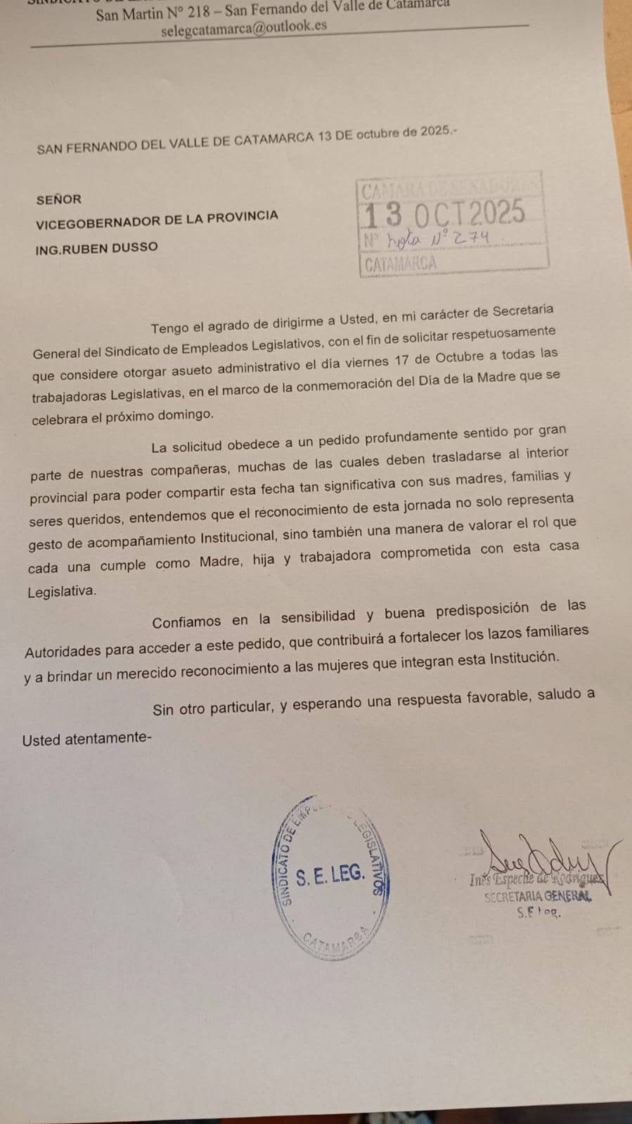 El Sindicato de Empleados Legislativos presentó una nota a las autoridades de ambas Cámaras Legislativas solicitando que el viernes 17 de octubre sea otorgado como asueto administrativo para todas las trabajadoras madres legislativas, en el marco de la conmemoración del Día de la Madre.
