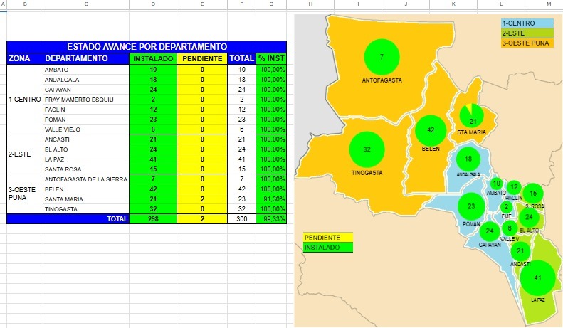 Hasta el momento, se han colocado antenas en numerosos establecimientos escolares rurales de los departamentos Belén, Tinogasta, Santa María, Andalgalá, Antofagasta de la Sierra, Capayán, Ancasti, Ambato, La Paz, Santa Rosa, El Alto, Paclín, Pomán, Fray Mamerto Esquiú y Valle Viejo, generando un cambio significativo en la vida escolar y comunitaria.