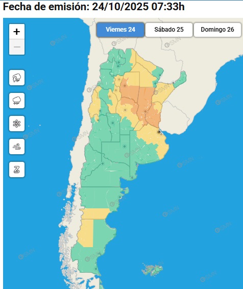 El área será afectada por tormentas de variada intensidad, algunas localmente fuertes. Las mismas estarán acompañadas por precipitaciones abundantes en cortos períodos, ráfagas que puntualmente podrían alcanzar los 70 km/h, actividad eléctrica frecuente y ocasional caída de granizo.