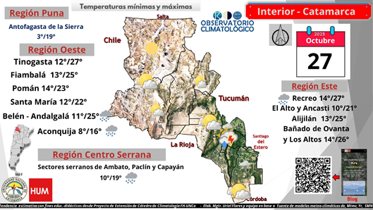 · Región Oeste: Tinogasta 12°/27° – Fiambalá 13°/25° – Pomán 14°/23° – Santa María 12°/22° – Belén/Andalgalá 11°/25° – Aconquija 8°/16°