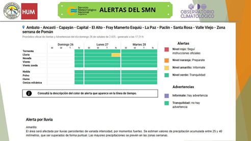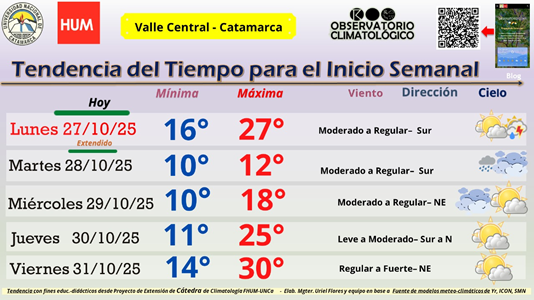 Hoy, lunes 27, durante la tarde y noche se prevé un cambio significativo de las condiciones del tiempo en gran parte del territorio provincial. Rige alerta amarilla por precipitaciones para el oeste serrano, centro y este de Catamarca, con probabilidad de lluvias entre el 70 y 90%, pudiendo registrarse chaparrones intensos y tormentas aisladas. El ingreso de un sistema frontal del sur provocará un descenso marcado de temperatura, incremento de la nubosidad y cambio en la dirección del viento al sector sur con intensidad moderada a regular.