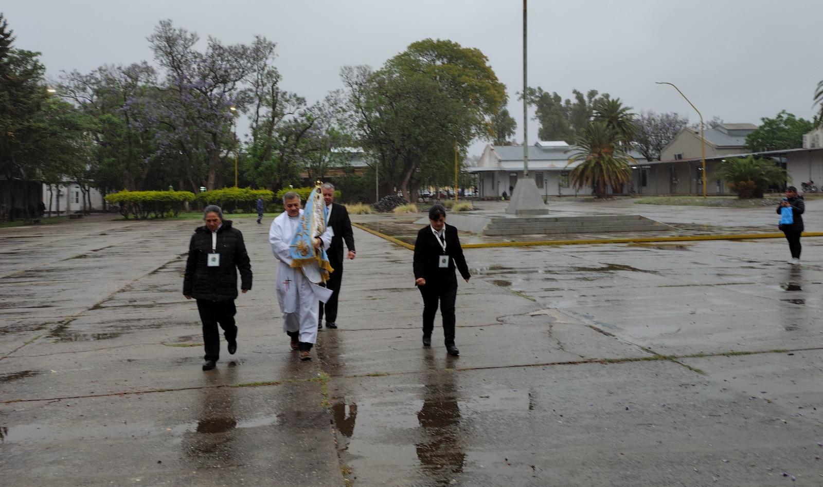 A pesar de la intensa llovizna, minutos después de la bienvenida, trabajadores de distintos pabellones del predio colmaron el recinto sagrado puesto bajo el patrocinio de San Fernando, rey, donde se congregaron para rezar el Santo Rosario y honrar a la Madre de los catamarqueños, que estará presente hasta las 20.00.