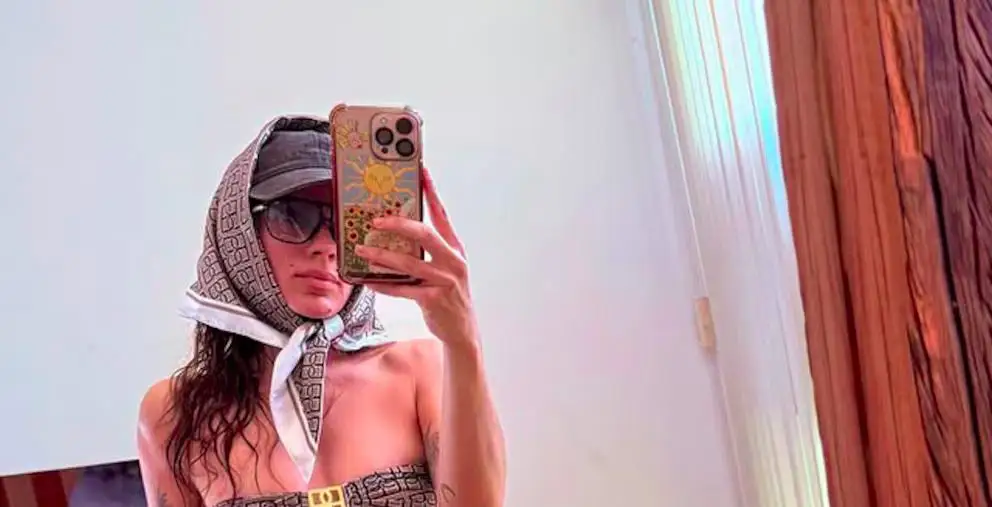 El estilismo, lejos de ser casual, jugó con lo sofisticado y lo relajado. Para completar el conjunto, Gimena eligió una gorra con visera, gafas de sol enormes y oscuras y un pañuelo a tono que llevó atado como turbante, generando un guiño vintage y sumando personalidad a la escena. El detalle de la hebilla dorada y la paleta neutra hizo que el look adquiera una vibra glamourosa de otras décadas, perfectamente actualizada. El interior de su casa, con pisos de madera y esculturas rústicas, terminó de componer el cuadro de “relax absoluto”, poniendo en foco a un outfit tan chic como auténtico.