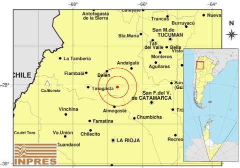 Epicentro: 54 km al SE de Belén; 57 km al N de Aimogasta; 66 km al SO de Andalgalá -28.056 (lat) -66.72 (long)