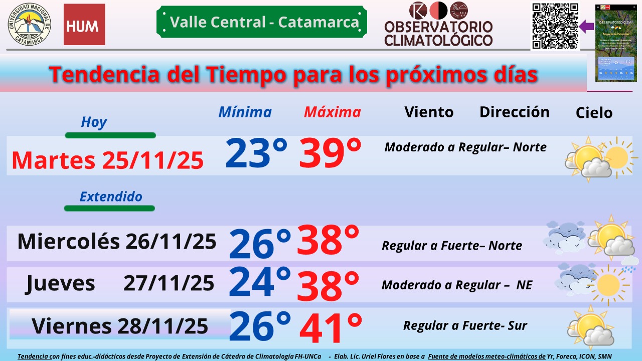 Para San Fernando del Valle de Catamarca, el martes inicia con valores mínimos en torno a 23°C y una máxima que vuelve a trepar hasta 39°C, con viento del norte de intensidad moderada a regular. El miércoles y jueves mantienen máximas muy altas, entre 38°C, con tardes donde el viento puede aumentar su fuerza especialmente hacia el final del día. El viernes se destaca como el día más extremo: la temperatura llegará a 41°C, con viento que podría intensificarse desde el sur hacia la tarde-noche, marcando la entrada de un sistema frontal que podría modificar las condiciones del fin de semana.