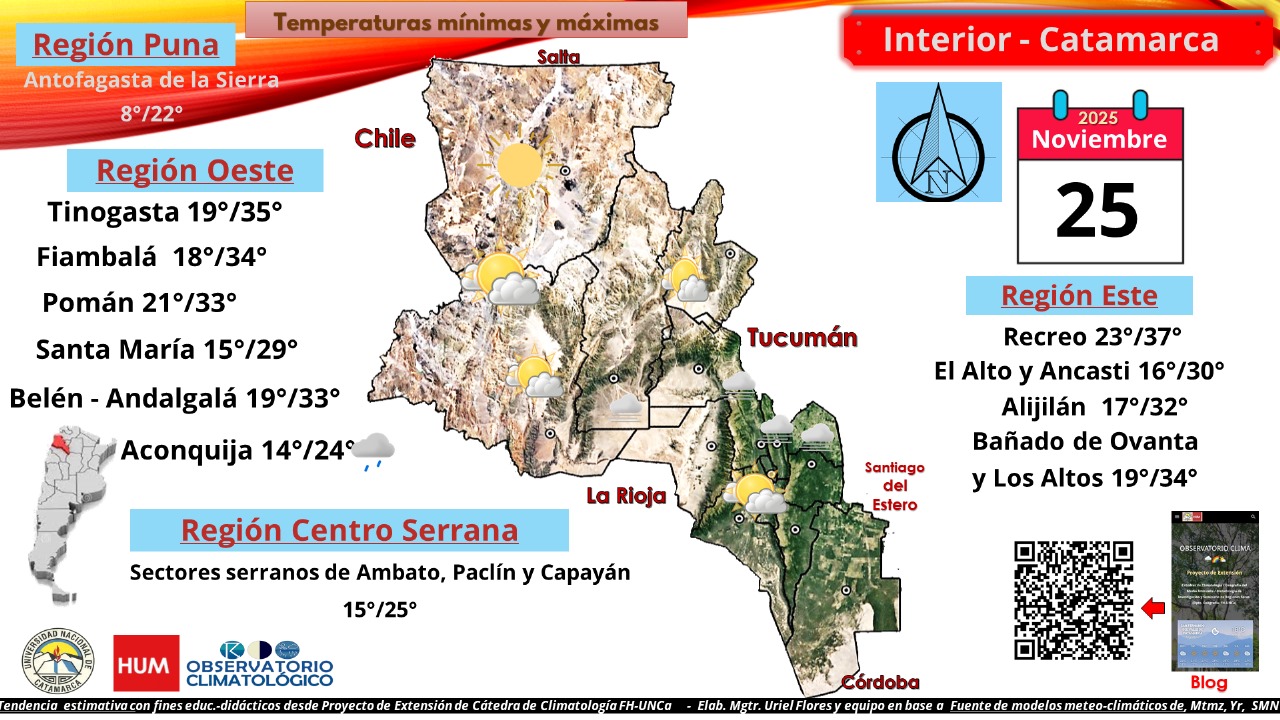 Región Centro Serrana: sectores de Ambato, Paclín y Capayán, 15°C / 25°C.