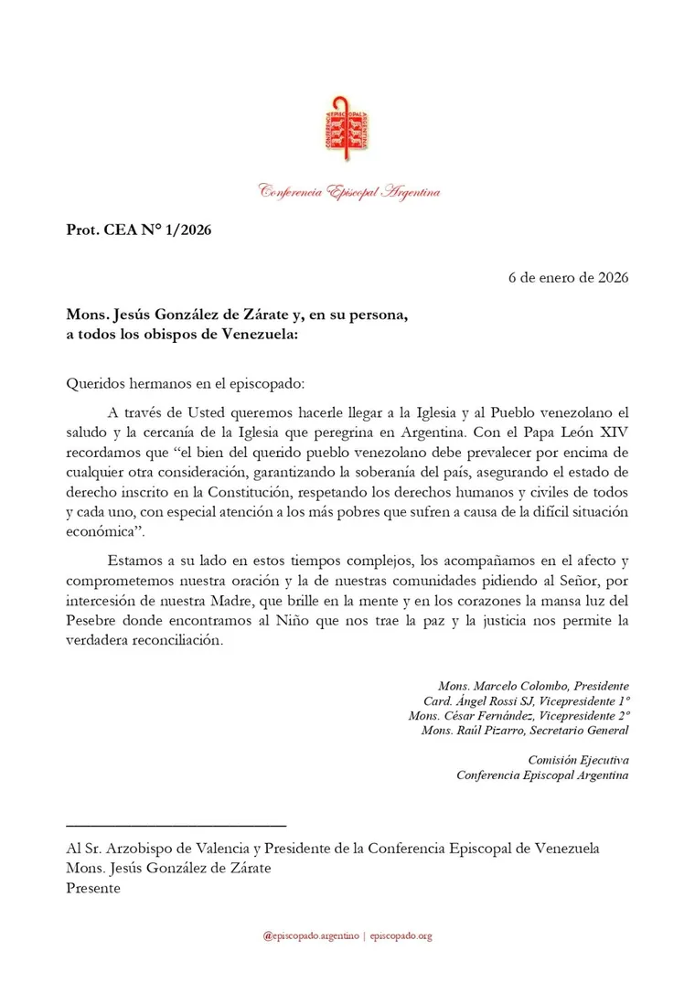 La iglesia argentina se pronunció este martes sobre la situación en Venezuela luego de la intervención de Estados Unidos que culminó con la captura de Nicolás Maduro. En una carta enviada por Conferencia Episcopal Argentina (CEA) a los obispos venezolanos, expresaron su acompañamiento y pidieron por el bienestar del pueblo.