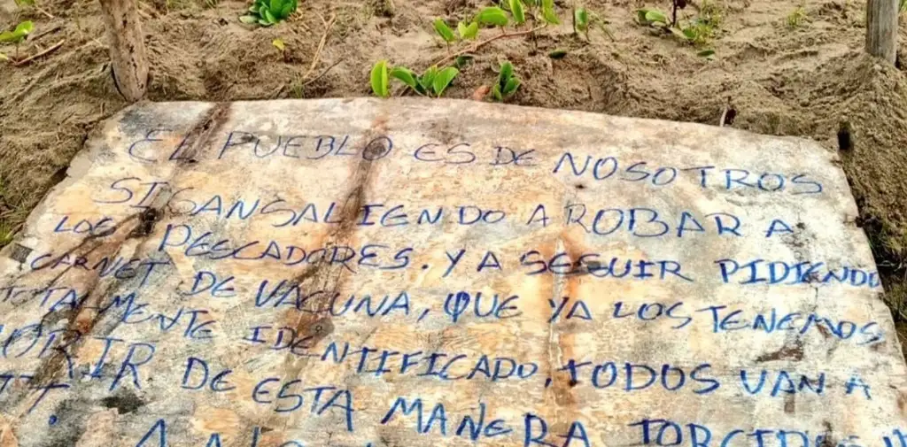 Allí se ve un cartel escrito sobre una tabla de madera que reza: "El pueblo es de nosotros. Sigan saliendo a robar a los pescadores y a seguir pidiendo carnet de vacuna, que ya los tenemos identificados".