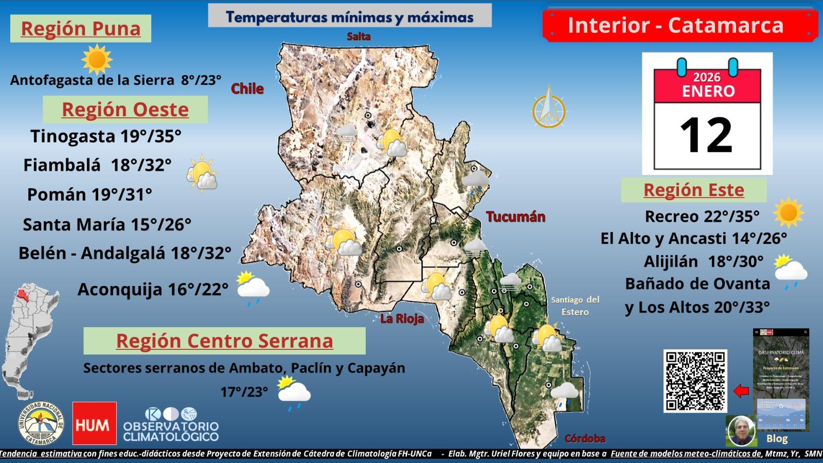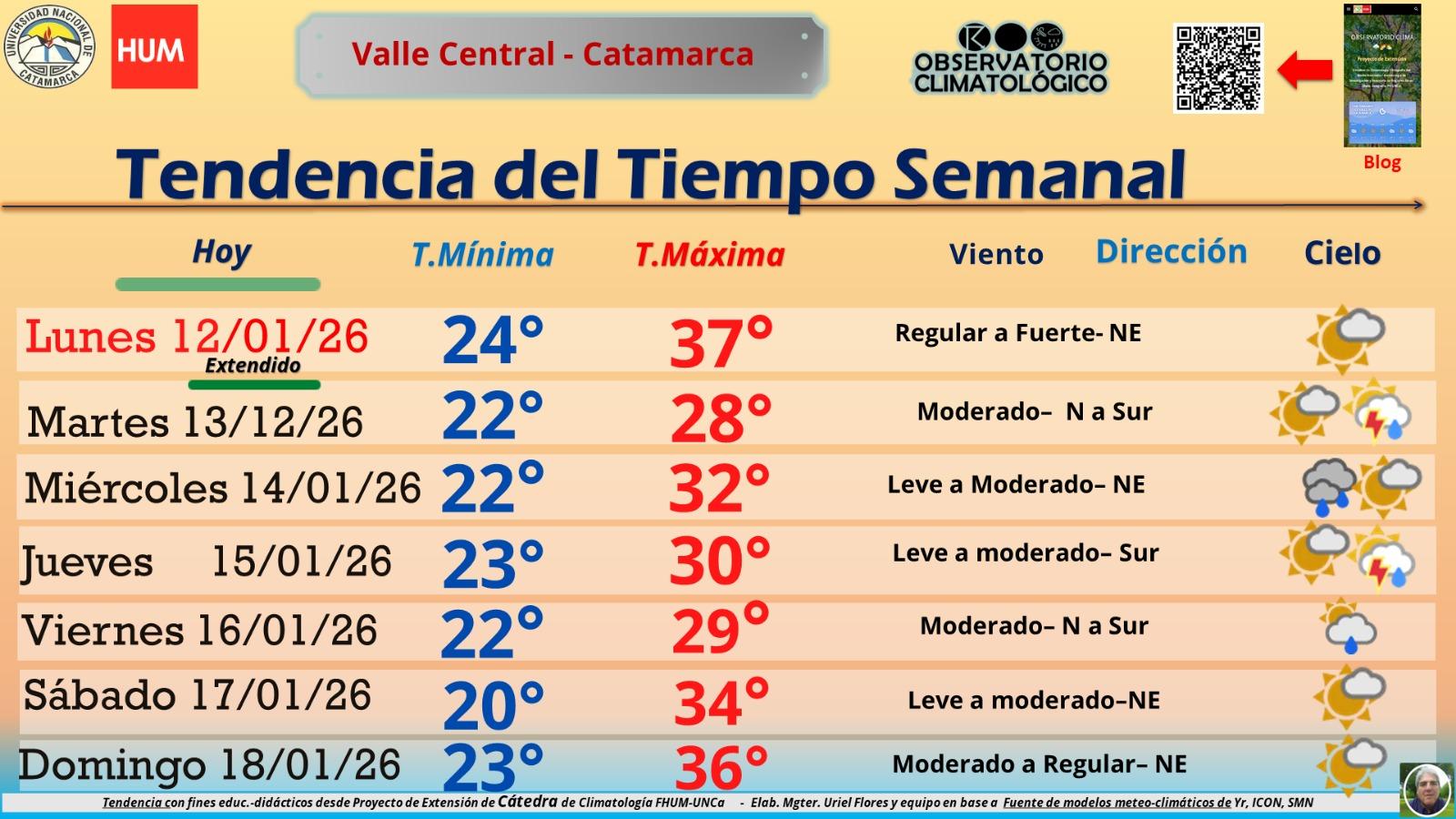 Durante el período comprendido entre el lunes 12 y el sábado 18 de enero de 2026, el Valle Central de Catamarca estará marcado por un ambiente caluroso al inicio de la semana, con temperaturas máximas elevadas y noches templadas, especialmente entre el domingo y el lunes, cuando los registros térmicos alcanzarán valores cercanos a los 36–37 °C.