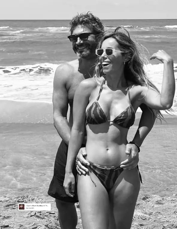 En la foto, Noble rodea con ambos brazos la cintura de su novia y sonríe. Ella corresponde al gesto con una expresión alegre y la mano alzada cerca de la cabeza. El diseño geométrico del bikini de Martina y la combinación de atuendos informales refuerzan la naturalidad del instante, mientras la elección de una canción romántica subraya el carácter íntimo del momento.