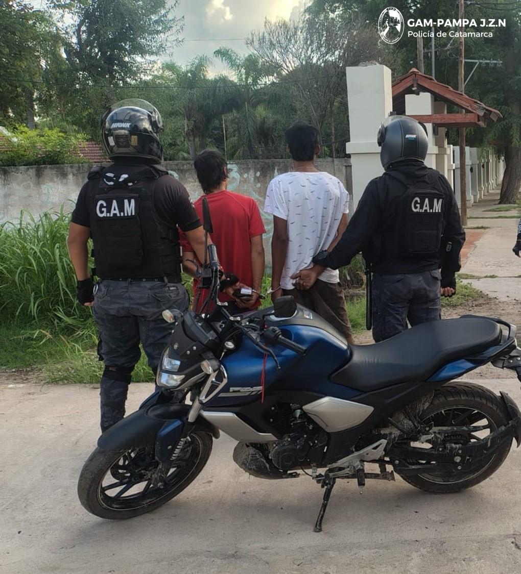 A las 18:50 de la tarde de ayer, mientras personal del GAM-PAMPA realizaba recorridos de prevención por la Ruta Provincial N° 41, a la altura de la localidad de San Antonio, Dpto. Fray Mamerto Esquiú, observó a dos personas del sexo masculino a bordo de una motocicleta Yamaha FZ, de colores azul y negro, y al notar la presencia policial, habrían emprendido la fuga, iniciándose una persecución que finalizó a los pocos metros, con la aprehensión de los jóvenes de apellidos Astudillo (21) y Pedraza (27), y el secuestro del rodado en el que circulaban, del cual carecían de la documentación.