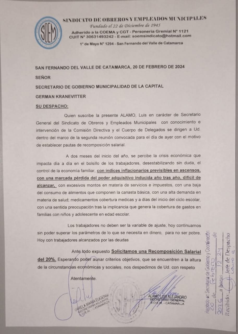 El Soem informa que en la mañana de este viernes se realizó el pedido formal de una recomposición salarial del 20% al ejecutivo municipal. Estamos en estado de alerta compañeros a esta negociación salarial. Los estaremos informando.