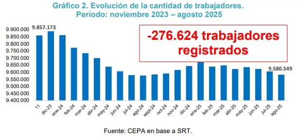 Por otro lado, en el mismo período, la cantidad de trabajadores registrados en unidades productivas se redujo un 2,81%, lo que representa una pérdida de 276.624 puestos de trabajo, al pasar de 9.857.173 en noviembre de 2023 a 9.580.549 en agosto de 2025, representando más de 432 (432,23) trabajadores registrados menos por día desde la asunción del gobierno de Milei. /El Destape